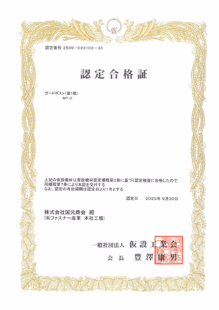 道路安全の要となるガードポストの製造において、メトロポストO型として厳しい品質基準と安全性を満たす製品を製造できることを証明する認定です。交通事故防止に重要な役割を果たす安全設備として、確実な強度と耐久性を保証いたします。