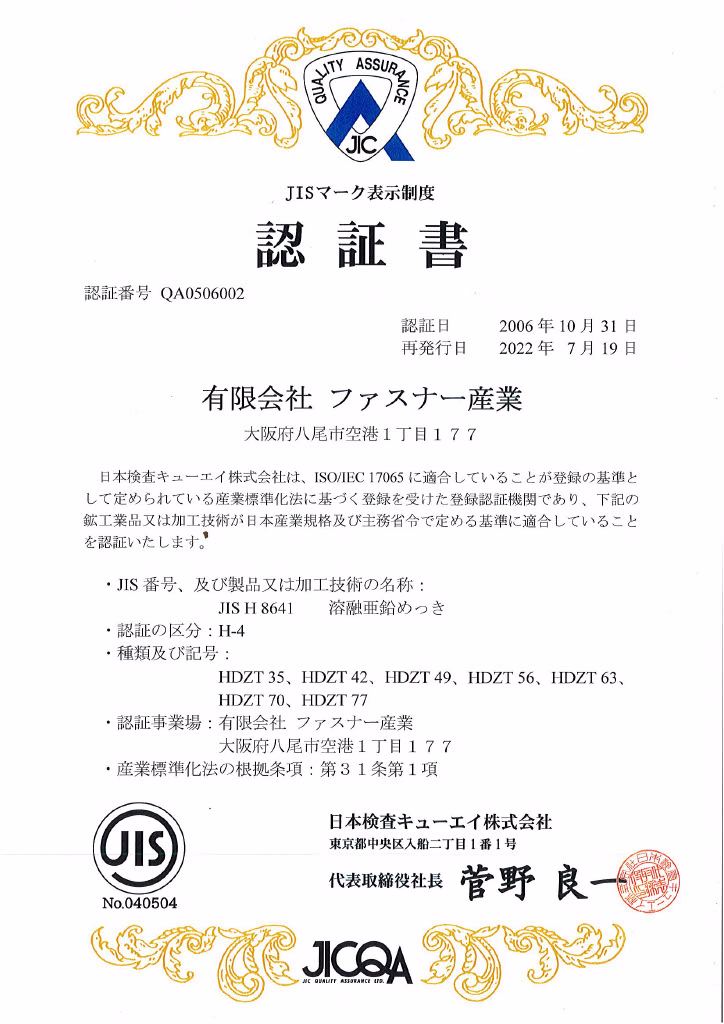 日本の産業製品に関する国家規格であるJIS(日本産業規格)が定める厳しい基準をクリアし、高品質で安定した溶融亜鉛めっき製品を製造できる工場として認定されています。耐食性・耐久性が求められる重要部品も安心してお任せください。